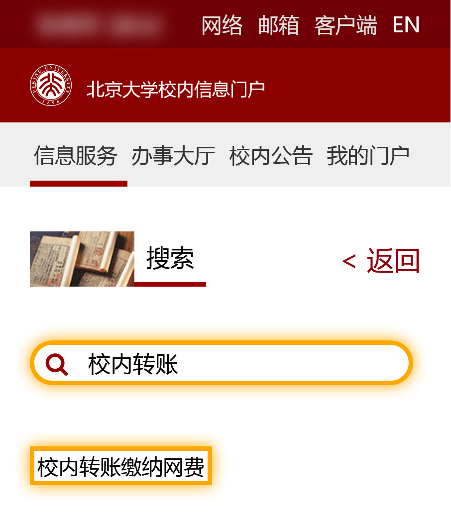 3. 登录北京大学校内信息门户(https://portal.pku.edu.cn),在办事大厅中寻找“校内转账缴纳网费”,或者直接搜索“校内转账”,点击进入校内转账缴纳网费业务流程。