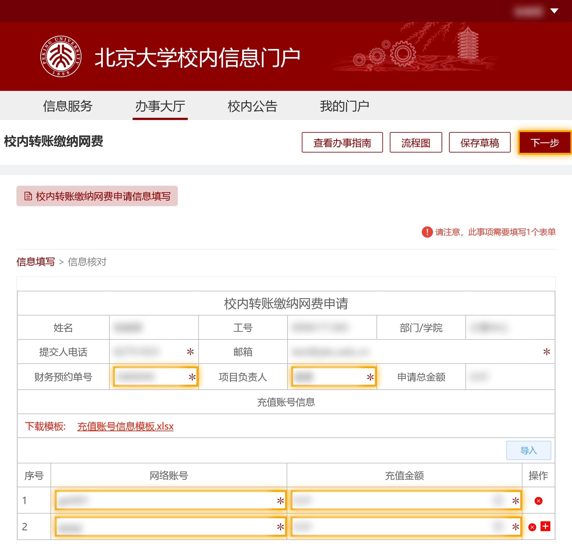 4. 填写预约单相关信息:财务预约单号和项目负责人,系统会自动检查预约单状态并显示对应的申请总金额。这两项信息必须和前面第一步预约单保持一致。填写充值账号信息:网络账号和充值金额,逐行添加输入即可,也可以通过Excel文件导入充值账号信息(在充值账号信息列表上方可以下载模板)。填写完毕,点击上方【下一步】按钮。注意:短信平台费只能给短信平台账号充值,网费不能给短信平台账号充值。