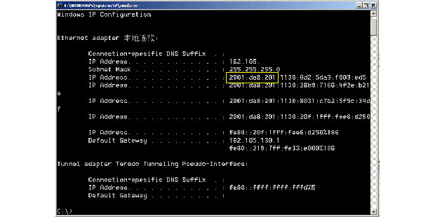 安装完毕后, 在DOS窗口中键入:ipconfig,如果是成功安装ipv6,会出现IP Address. . . . . . . . . . . . : 2001:da8:201 字样。