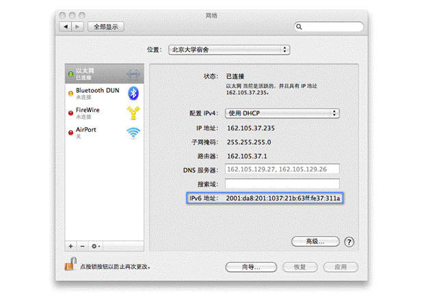 Mac OS X (10.3 及之后版本)默认支持 IPv6(Internet Protocol version 6),所以在北京大学校园内联网后,不需进行任何设置。如需检查自己的IPv6 是否连接,点击屏幕左上方苹果图标,进入“系统偏好设置”,点选“网络”,若在右侧看到“IPv6 地址: 2001:da8:201...”等字样,说明已经正常连接。如图中蓝框标识: