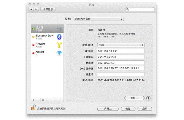 3)、在左侧列表中选择“以太网”。在右侧的“配置 IPv4”选单中选择“手动” (如不能点选,可点击左下方的小锁头图片并鉴权),并在“IP 地址”栏内填入需要的地址(如 162.105.37.251),子网掩码填入 255.255.255.0,路由器填入相应的网关地址(如 162.105.37.1),DNS 服务器填入 162.105.129.122, 162.105.129.88 。点击“应用”即可。